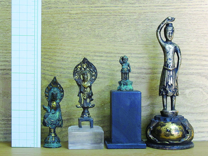 店主コレクションなどの手のひらサイズの小さな仏像の展示。